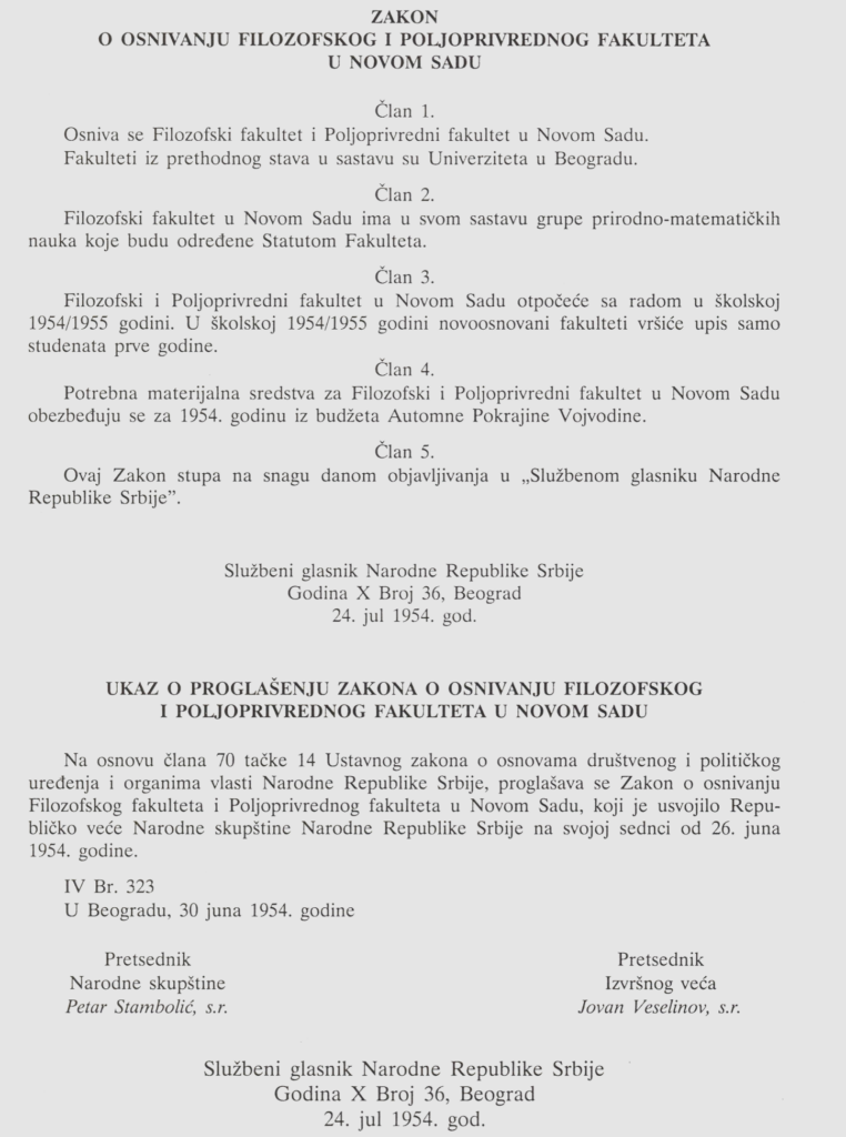 Republičko veće Narodne Skupštine Narodne Republike Srbije na sednici od 26. juna 1954. godine donelo je ukaz o proglašenju Zakona o osnivanju Filozofskog i Poljoprivrednog fakulteta u Novom Sadu, a zakon je proglasio predsednik Izvršnog veća NR Srbije, Jovan Veselinov, 30. juna 1954. godine. Sve je počelo realizacijom višegodišnje potrebe za visokoškolskom institucijom u Vojvodini čiji je zadatak, pored obrazovanja agronoma, i razvoj naučno-istraživačkog rada i poljoprivredne proizvodnje u pokrajini i zemlji u celini. Te davne 1954. godine stekli su se društveni i ekonomski uslovi, koji su omogućili donošenje Zakona o osnivanju Filozofskog i Poljoprivrednog fakulteta u Novom Sadu u sastavu Univerziteta u Beogradu, sa upisom u prvu godinu studenata u školskoj 1954/55. godini.